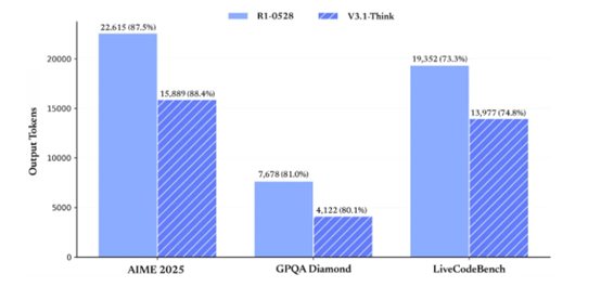 The advantage of this hybrid architecture lies in its balance between response speed and answer quality. According to DeepSeek's official test data, V3.1-Think achieves equal average performance across various tasks compared to R1-0528 while reducing output tokens by 20%-50%, truly realizing the efficiency improvement of "less is more".